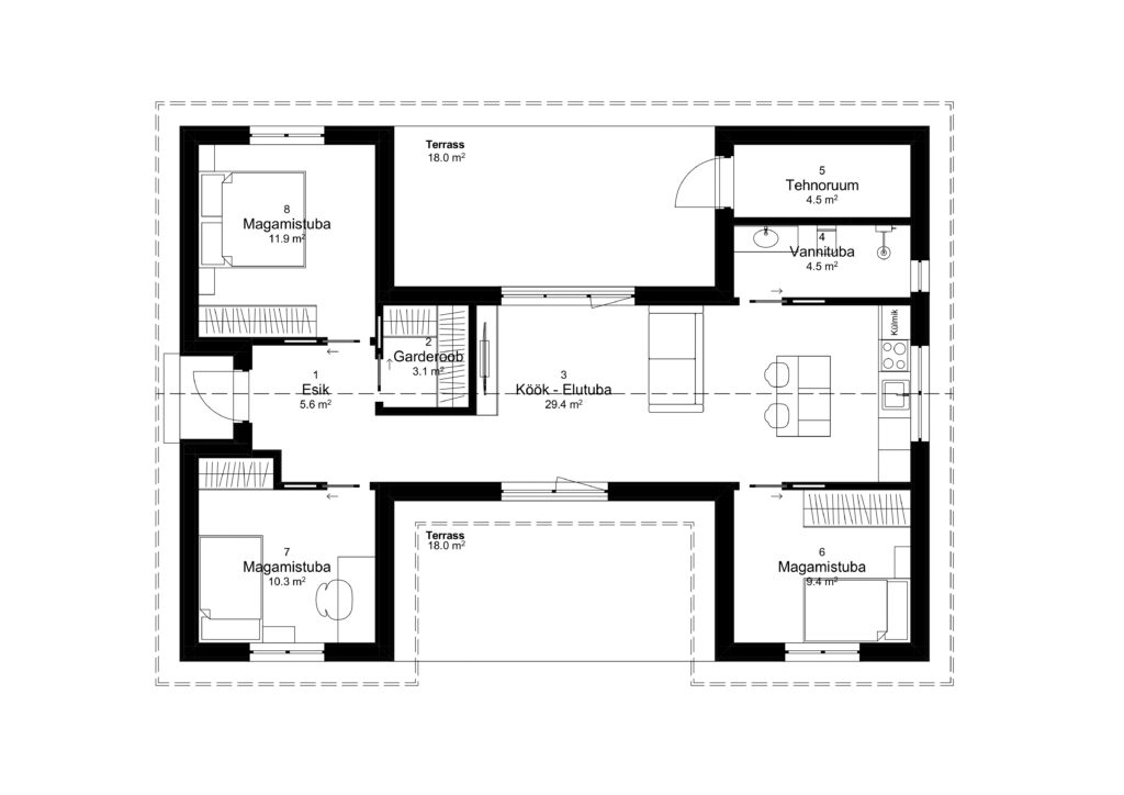 Põhikorrus on lahendatud kolme omavahel seotud moodulina, luues selge ja funktsionaalse ruumistruktuuri. Moodulipõhine lahendus tagab loogilise ruumijaotuse, hea loomuliku valguse ning paindlikkuse kasutuses.