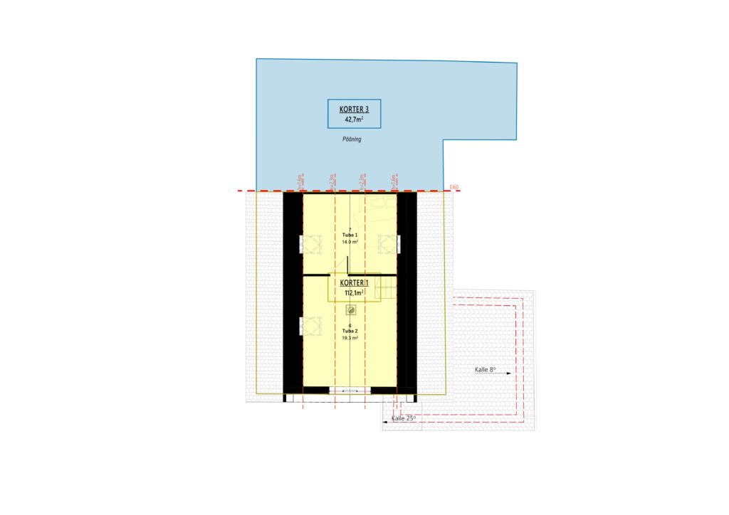 Korter nr 1 netopind on 112,1m2 ja ehitisealune pind 148,9 m2.
